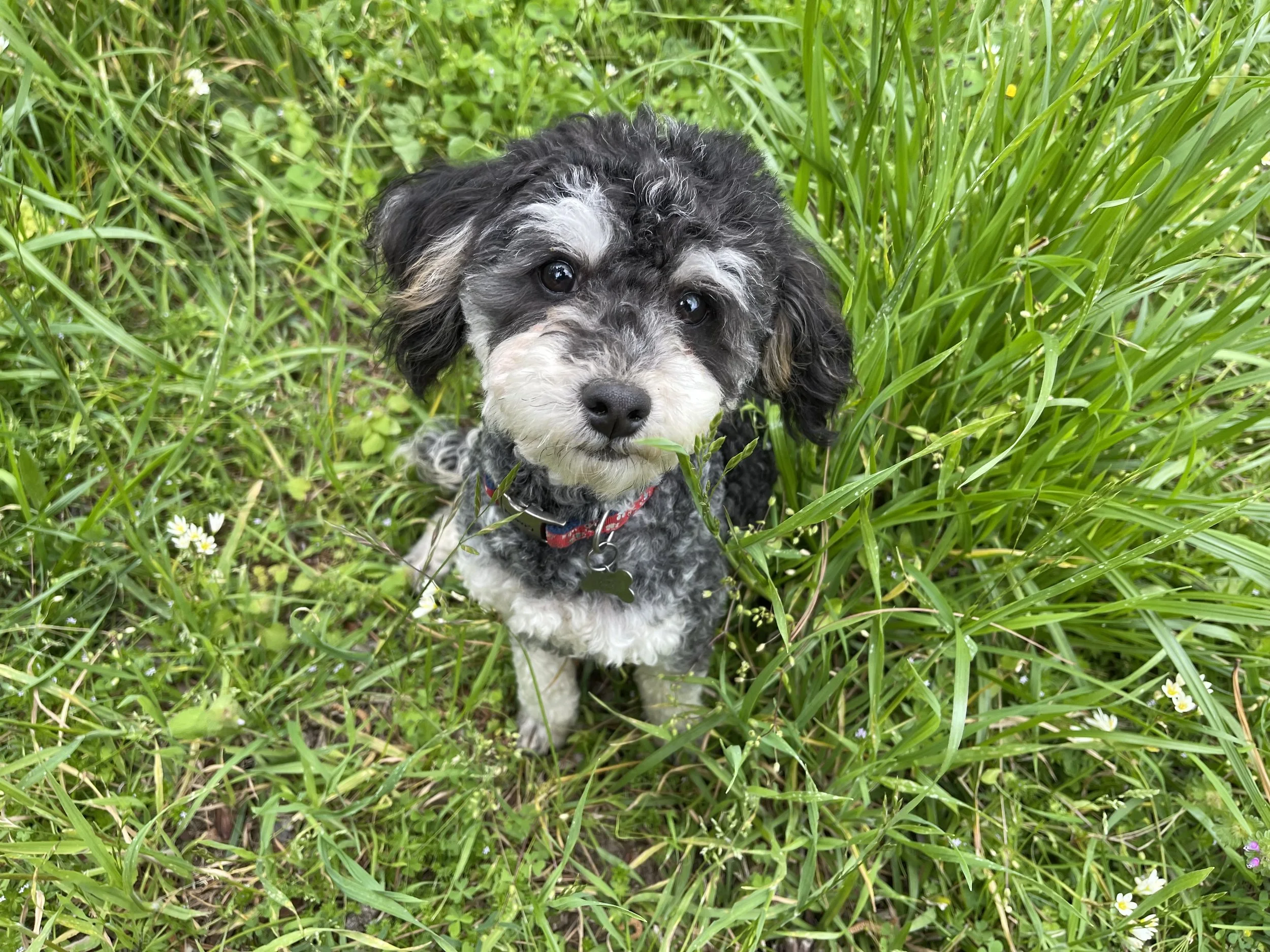 Axle is our handsome 10lb Phantom Blue Merle Toy Poodle. Though naturally timid, he thrives when he’s by my side visiting clinics and doctors’ offices, where his intelligence and charm quickly win people over. He’s incredibly smart, loyal, and beloved everywhere he goes—an essential part of our program and family.